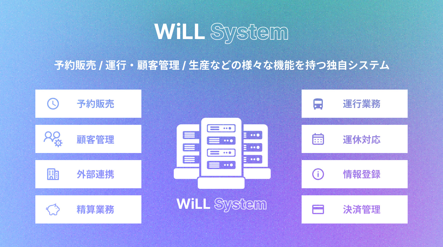 WiLLシステムは「バス」「フェリー」「鉄道」「旅行」などありとあらゆる観光・交通の予約・管理システムでインバウンドにも対応しております。